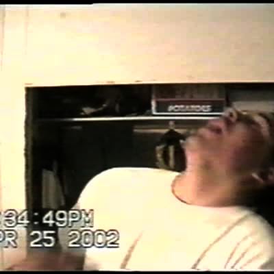 An adult man falls off a very high ladder as it collapses in a front yard. Security footage.