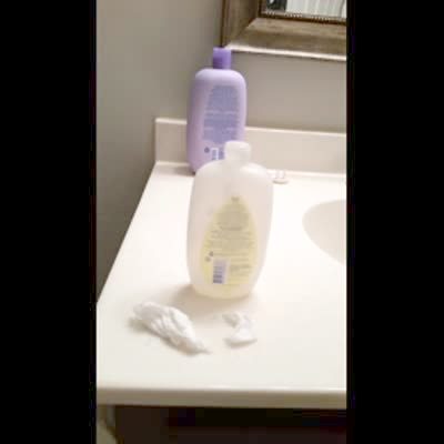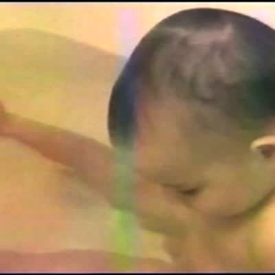 Baby in bath tub farts, creating a small bubble from its butt. Bathroom.