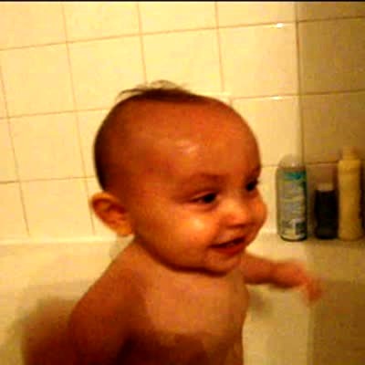Baby drops soap in tub - it splashes a bubble mustache onto his face