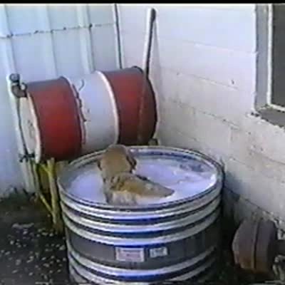 Dog takes bath in small tub, walks in circles, plays in bubbles