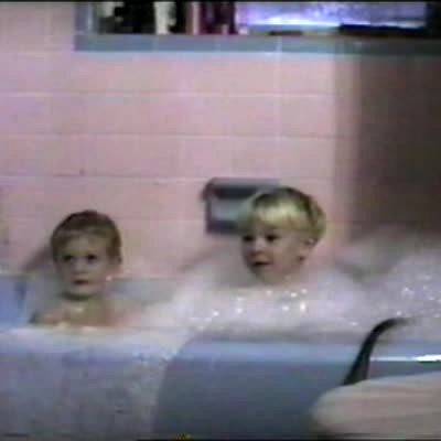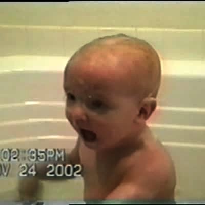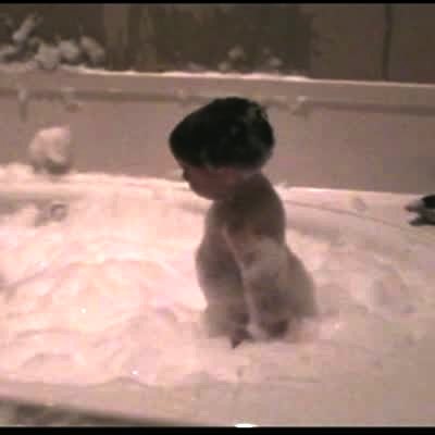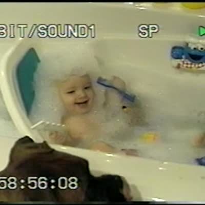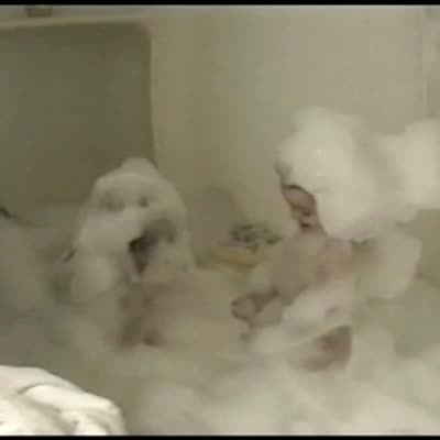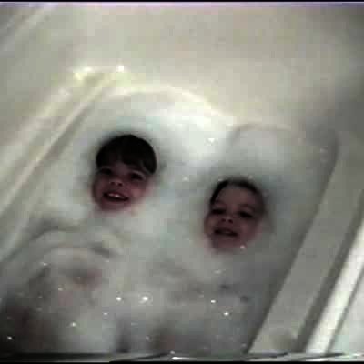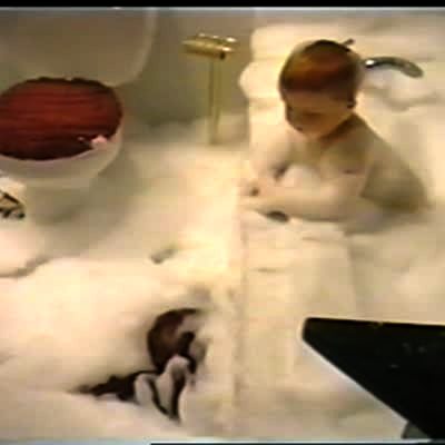 Little girl & tot boy are covered in bubbles in bath tub. Boy slips / falls under & disappears, then stands up opening his mouth wide. Short tail.