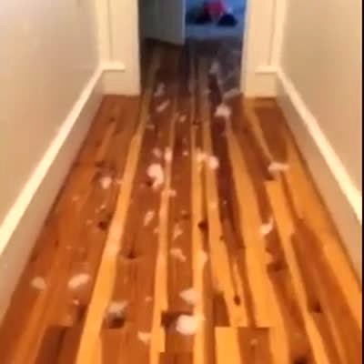 A mom follows a trail of soap bubbles through a house and into a bathroom that is covered in bubble bath soap as two young girls play in a bathtub. The mom says it is a disaster and the girls laugh.