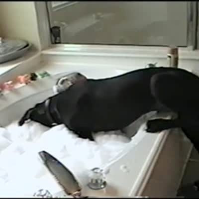 "Big Bubble Trouble" Young boy takes a bubble bath & Great Dane puppy dog jumps into the tub with him. Boy starts screaming & laughing. Bathroom.
