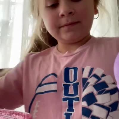 A young girl peels open a bath bomb wrapped in plastic then drops it into water and it starts to bubble up and spill. She yells, "Shoot, shoot, shoot!" Influencer flubs.