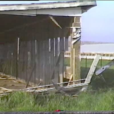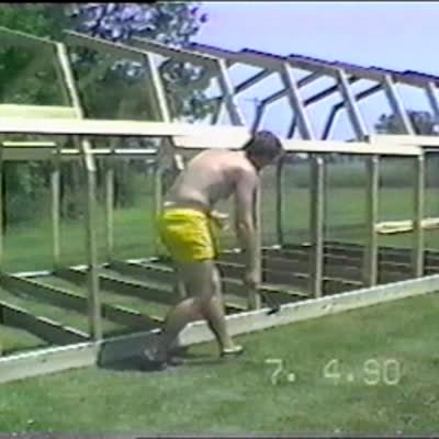 A young girl hides behind in the hallway. She and the other young girl behind the camera run into the kitchen and yell Happy Birthday at a senior man. The senior man jumps up, clutches his heart and says, "What the hell?" The girls laugh and the man walks into the other room to sit down.