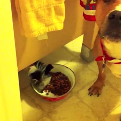 "Bowl Bandit" Little gray dog sneaks bites of food from brown and white pit bull dog's bowl whenever he looks away in kitchen.