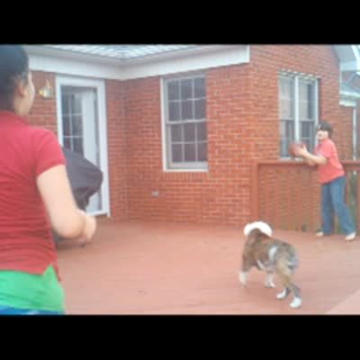 A boy and a girl play with a ball on a porch while a bull dog plays monkey in the middle. The boy bounces the ball and the dog tries to do a back flip to catch it. Unable to flip, the dog lands on his back before getting up.