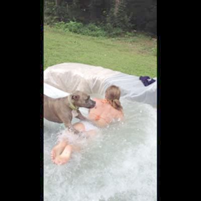 A Pitt Bull dog climbs on top of a teen girl sliding down a slip and slide outdoors. A teen boy slides down behind them and knocks the girl over.