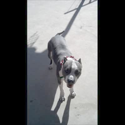 A pit bull runs around in the yard, then knocks the camera over when he runs into it. Security footage.