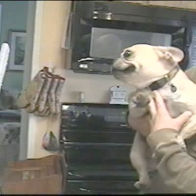 Man holds a bull dog and a woman shows it the vacuum. Dog makes a funny screaming sound & goes crazy.