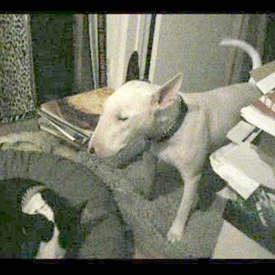 White bull terrier dog makes strange growling / whining noises at other bull terrier in its bed in living room.