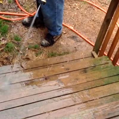 A Pitt Bull dog attacks a water hose from under a flight of stairs on the back porch.