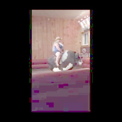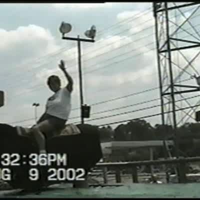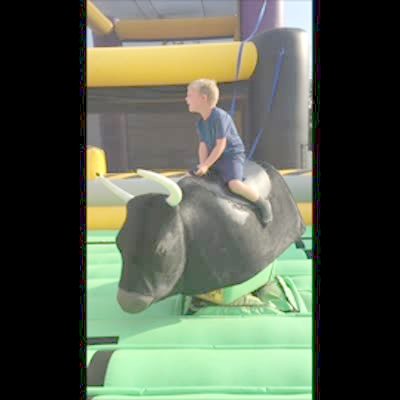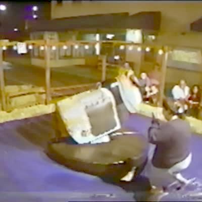 A young boy attempts to ride a mechanical bull but falls off then gets nailed into by the bull, as he flies out of frame.