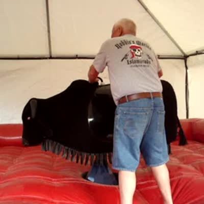 Man rides mechanical bull. Before he does, he tries several times to get on the bull and he falls off over and over again.