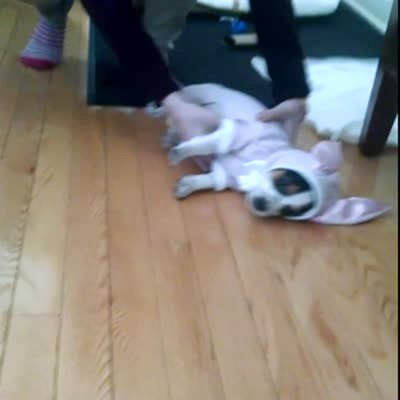 A man in an Easter Bunny costume walks into a room like a zombie and scares his tot and baby daughters. They scream and cry.