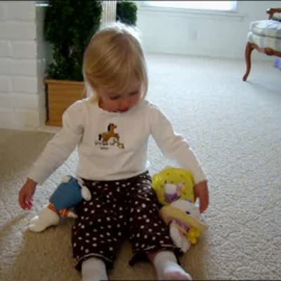 Tot girl sits on floor and plays with Easter Bunny toys. Dad farts loudly OC, girl says "daddy tooted"
