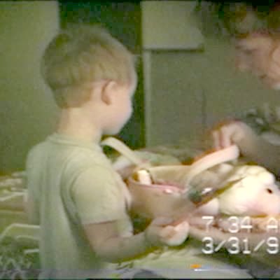 A woman walks into her living room dressed as the Easter bunny, and her head falls off. Her young boy realizes it's her and says "that's momma" as she walks out of the room.