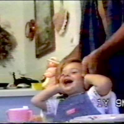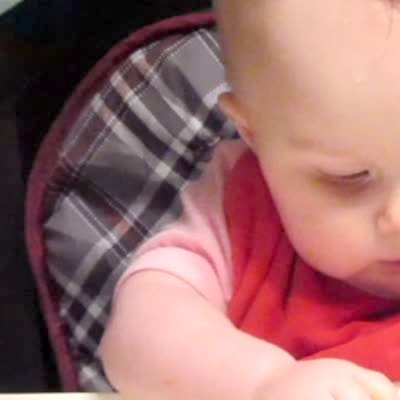 A baby girl in high chair lets out a burp at 0:18. She startles herself a little.