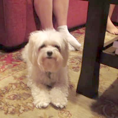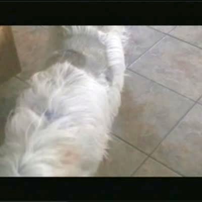 Man (filming) asks white fluffy dog if he had a good dinner. Dog burps loudly.