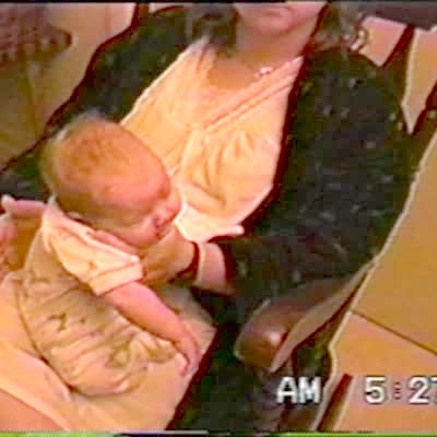 Baby girl in crib looks peacefully at mom (camera), dad burps / belches loudly OC, surprises / scares baby. She starts crying hard.