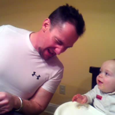 A man asks his baby boy to say "Daddy" and the boy burps loudly indoors.
