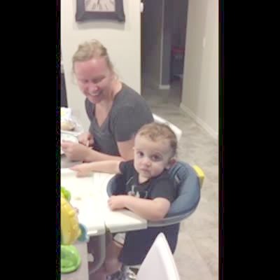 A tot boy frowns at the dinner table when a woman burps loudly, scaring the boy and causing him to smile.
