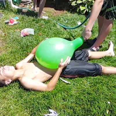 A young boy lays on his back on the patio with a large water balloon on his chest that he fills with a hose. The balloon fills up and then bursts in slow motion.