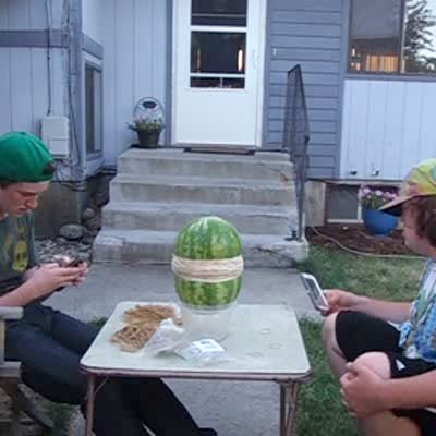Two teen boys put rubber bands on a watermelon until it bursts.