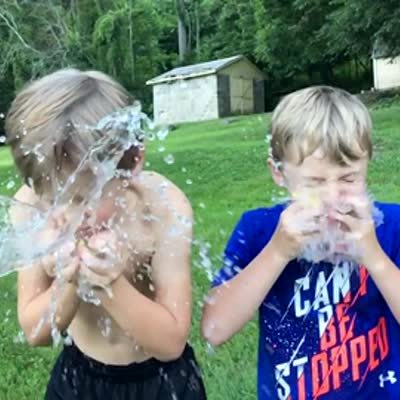 Two boys bite into water balloons in slow motion in the yard and the balloons explode in their faces.