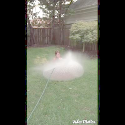 A woman sits inside a large water balloon with only her head outside of it as it fills up with water from a hose in slow motion. The balloon bursts and water flows through the yard. AA: super slo-mo balloons