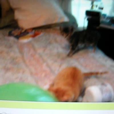 Kitten plays with balloon on bed and jumps, runs around when it pops. Cat.