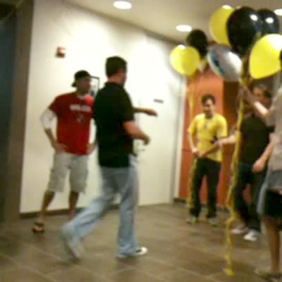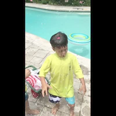 A man throws a water balloon up into the air and it falls down and bursts directly on his young son's head. The boy cries, and his older sister berates the man for his throw.