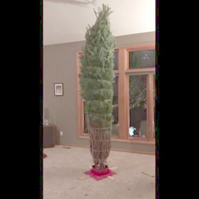 A young woman takes the binding off a Christmas tree. The branches burst open when she snaps the last twine.
