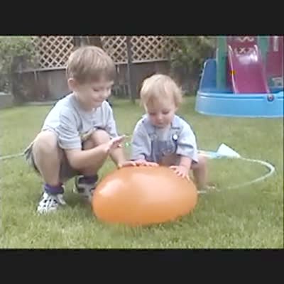 Mishap: A young boy and a baby girl play with a giant water balloon. The baby girl leans on the water balloon it pops, and she falls.