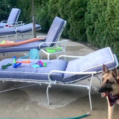 A woman throws a water balloon in slow motion to a dog on the pool patio and the dog bites it and it explodes and gets a young boy wet.