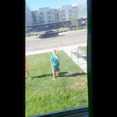 A woman records a video from inside a house of a young boy in the yard as he throws a water balloon at the house and breaks the window in front of her.