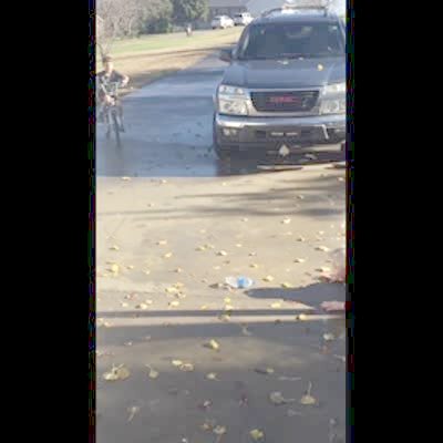A young boy rides his bike over a water bottle so that it bursts and splashes his brother in the face in slo-mo