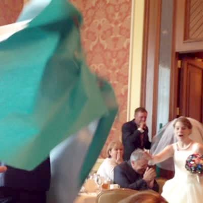 A man bursts through a banner at a wedding reception. He knocks over the wedding photographer woman as he runs.**SAME CLIP AS 743566**