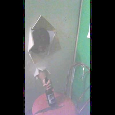 A man bursts his arm and head through a wall to drink a beer indoors.