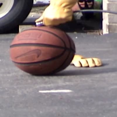 Man inflates a basketball very full of air. He bounces it several times and it explodes. Long for edit.