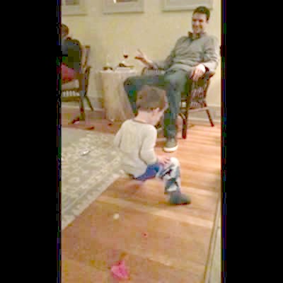 A tot boy sits on a balloon in the living room and it pops in slow motion and he falls.