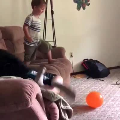 A young boy jumps off a living room couch and tries to pop a balloon and he slips and falls backwards and hits his head on the couch.