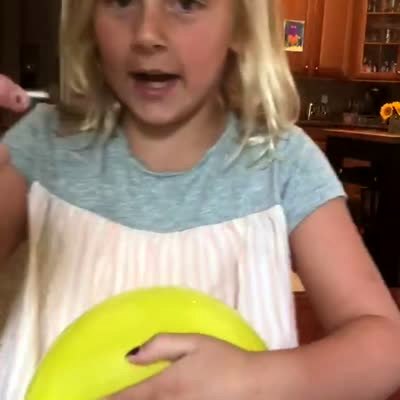A young girl in a living room talks to the camera as she holds a balloon with a piece of sticky tape on it. She pushes a nail through the tape and the balloon doesn't pop and she is surprised. She says to try it yourself and the balloon pops and startles her.