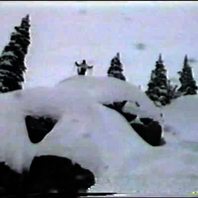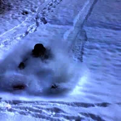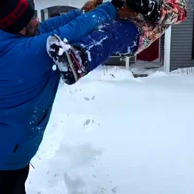 A man throws a young girl into deep snow in slow motion and she is completely buried.