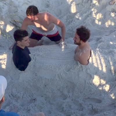 Teens pretend they're going to use the head of a boy buried in the sand as their football. The tide comes in & surprises them, water hits boy in the face. A woman screams. Beach, ocean.