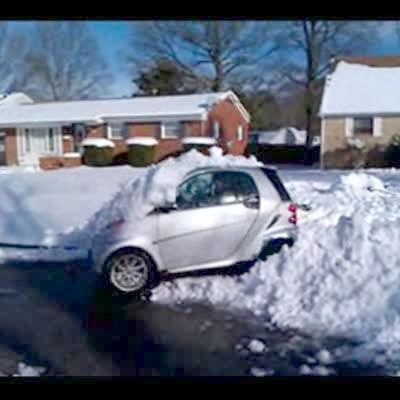 A small smart car is buried under a large snow pile on a residential road. It drives out of the pile. Winter.