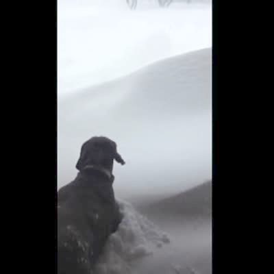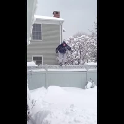 A big dog gets buried in snow at 0:15 when trying to hop into yard.