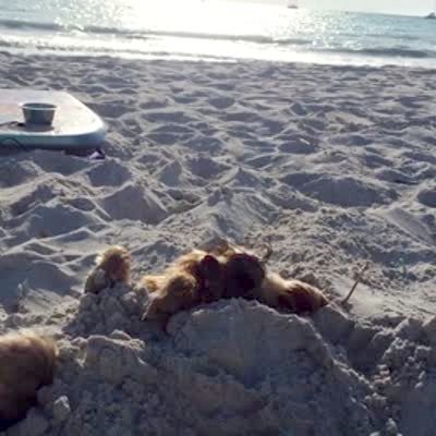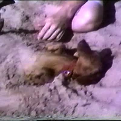 Bury That Dog. Boy buries dog at beach and dog falls asleep.
