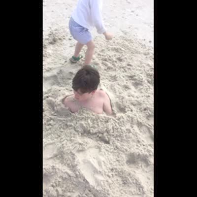 "Sandhassle" A young boy is buried up to his neck in the sand. His little brother repeatedly tries to sit on his head and rub his butt on his head. Brother pleads with mom to make him stop. Beach.