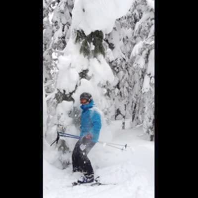 A man in ski clothing shakes a snow-covered tree outdoors and a large pile of snow falls down on him, burying him.